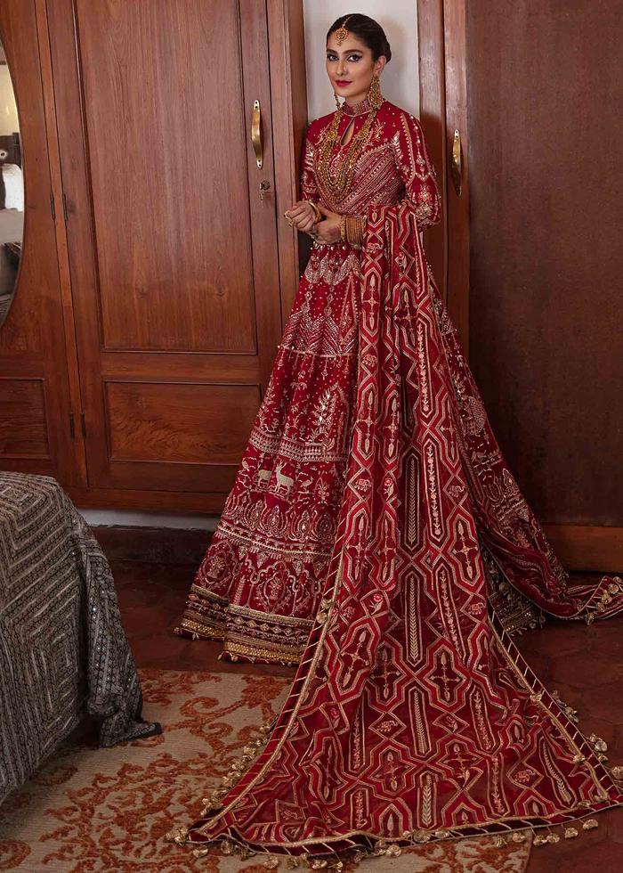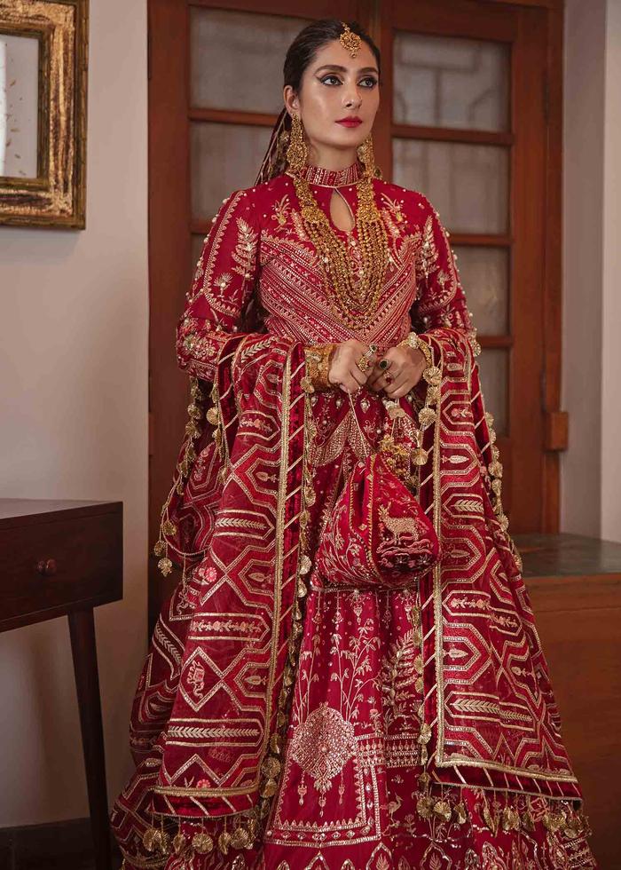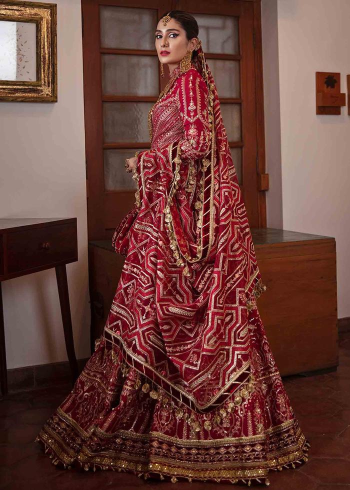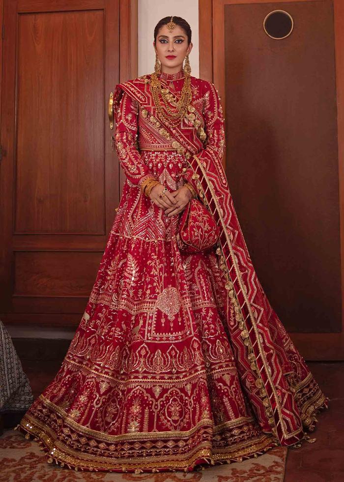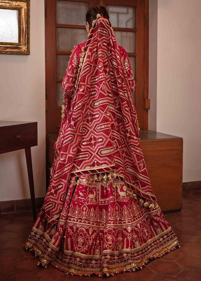 Description: A sindoori red raw silk base is generously embroidered with tilla, resham and sitari to form a beautifully composed lehenga, choli and dupatta. The stunning outfit is beautifully hand rendered with gotta, cutdana, pearls, naqshi and dabka. The kalis sport beautiful Shakargah inspired embroideries and velvet borders. The dupatta features a patchwork jaal with elephant and floral embroideries and velvet borders.