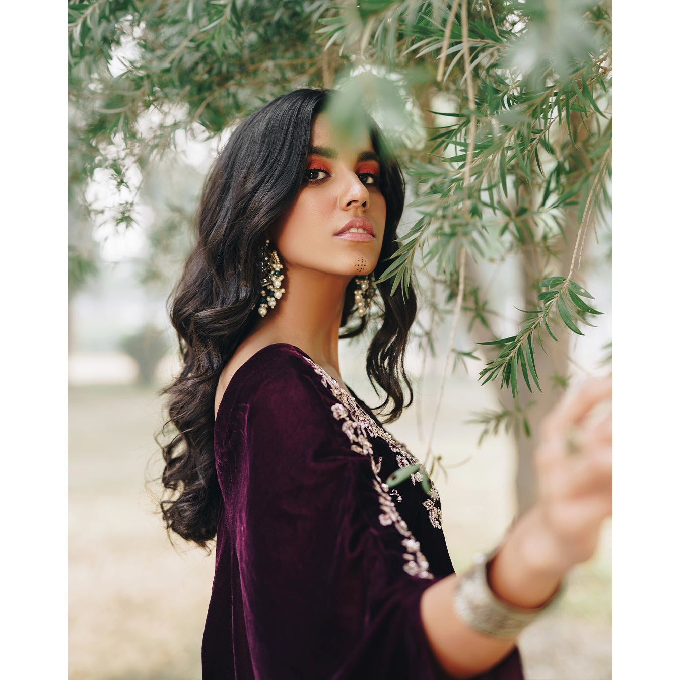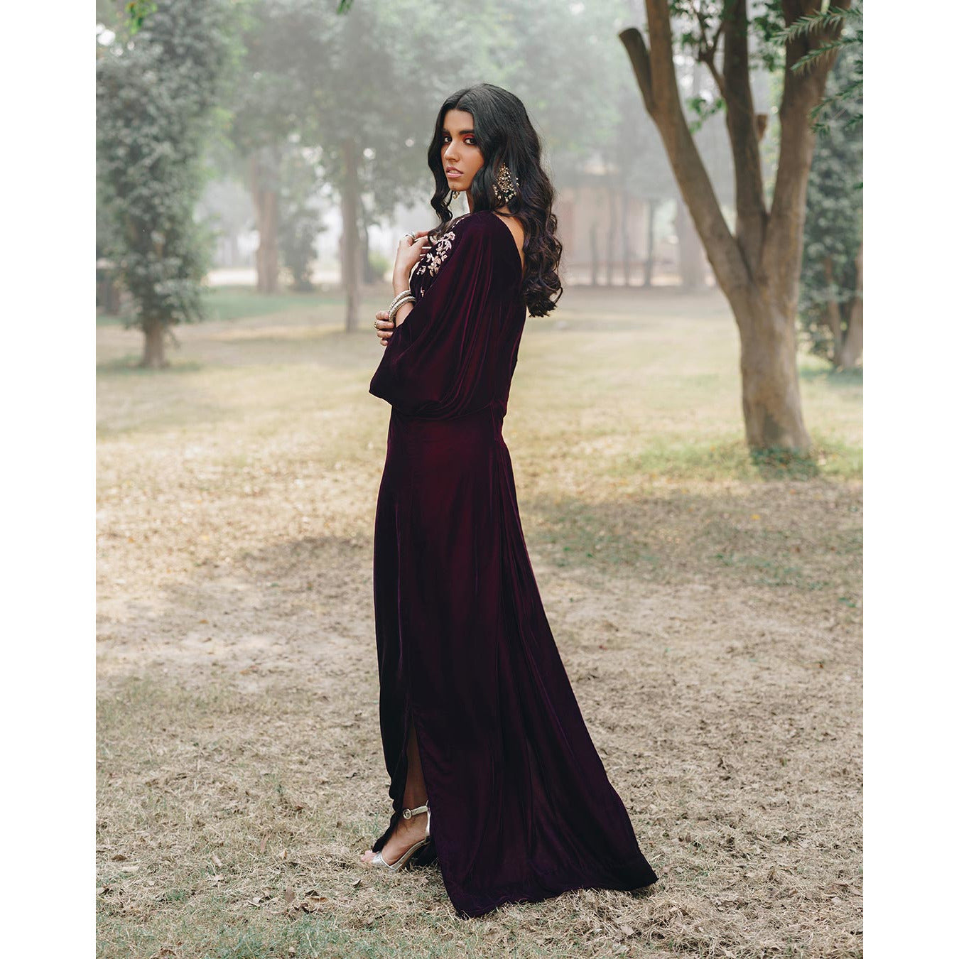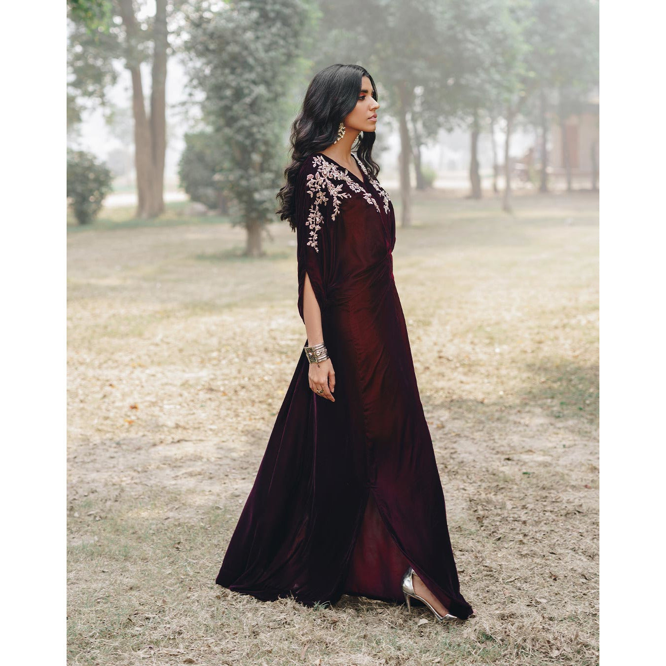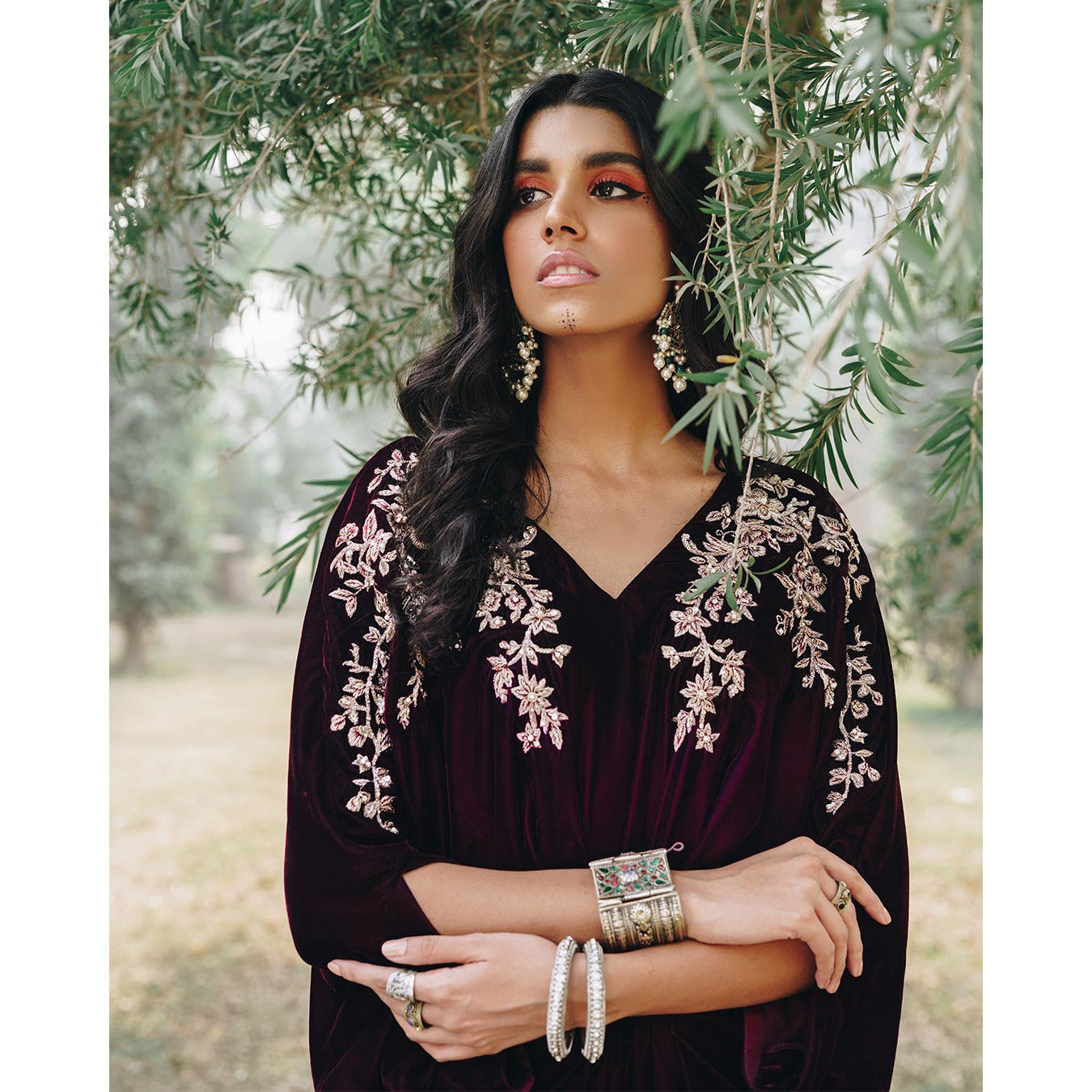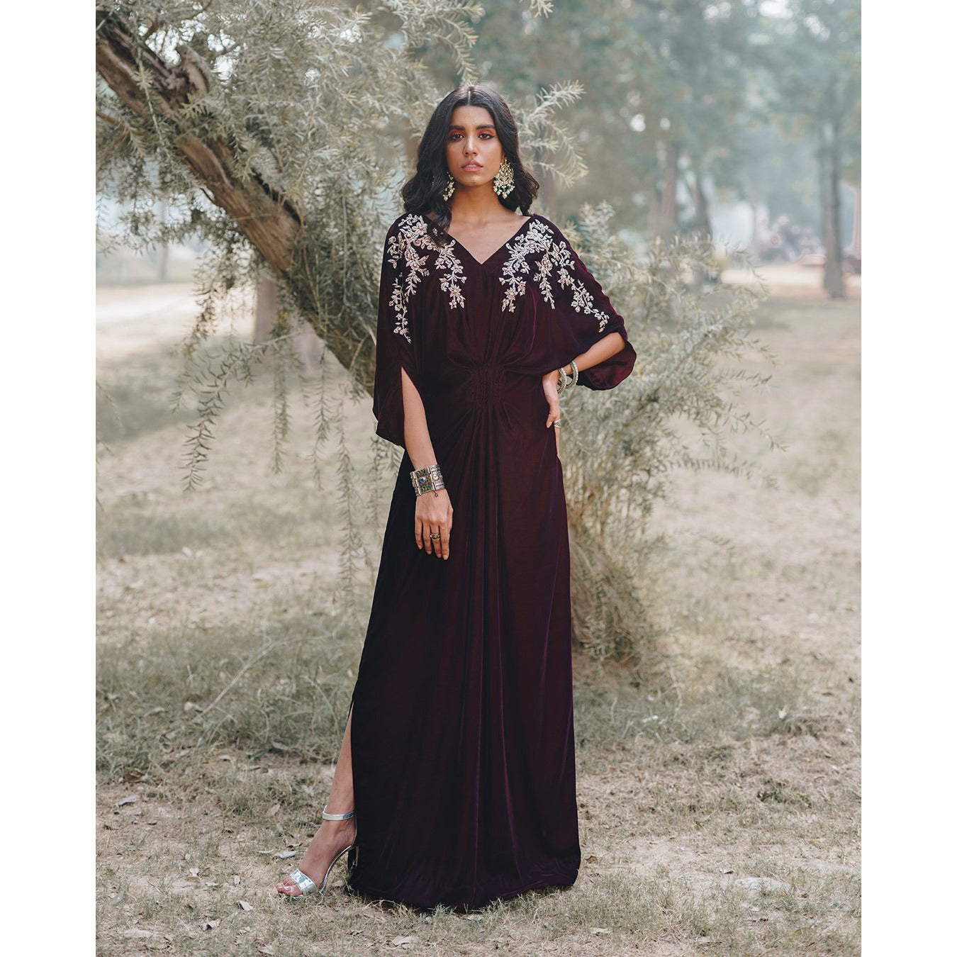 An elegant kaftan silhouette featuring embroidered floral trellises coming down from the shoulders. This chic silhouette is a must have for your winter wardrobe.