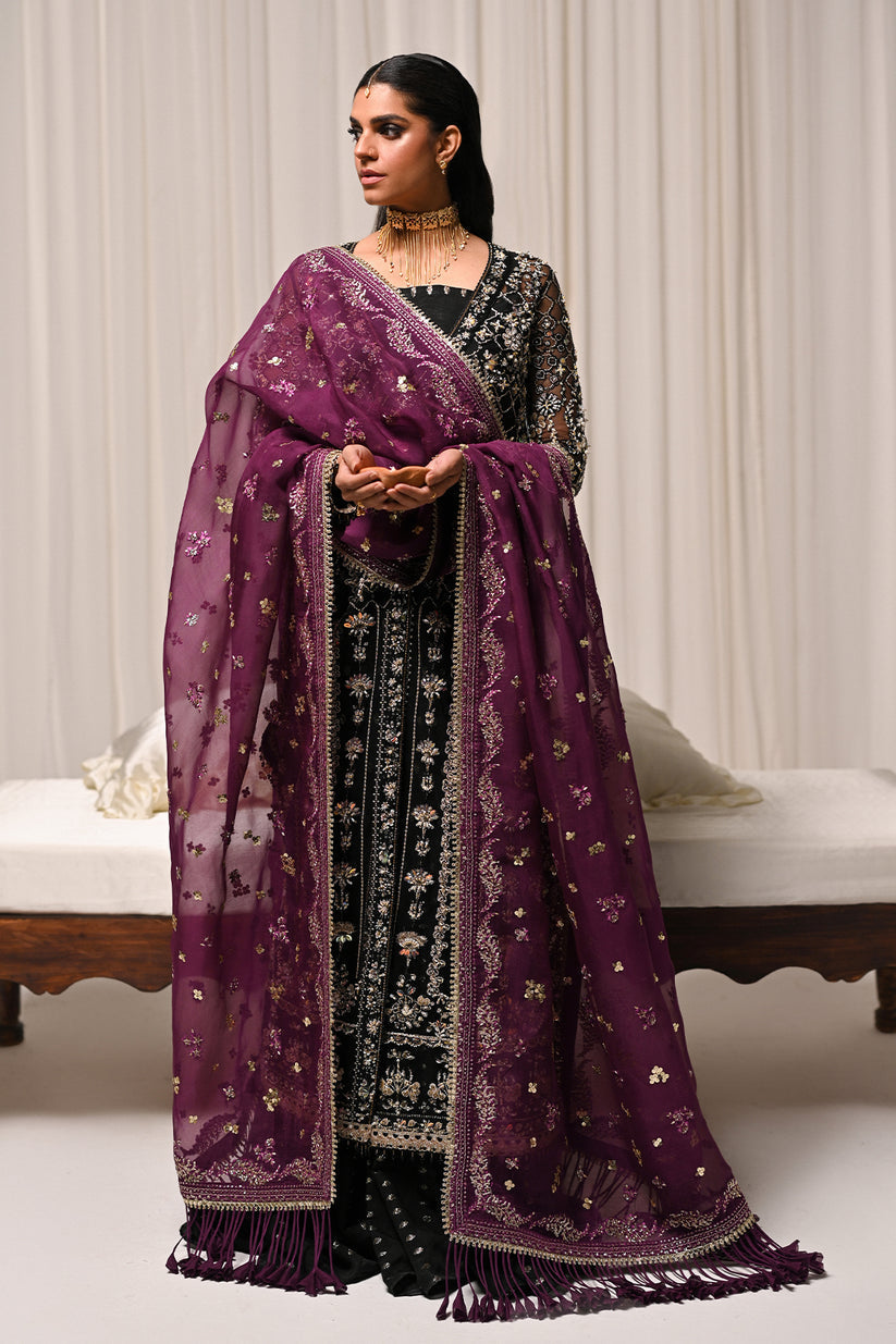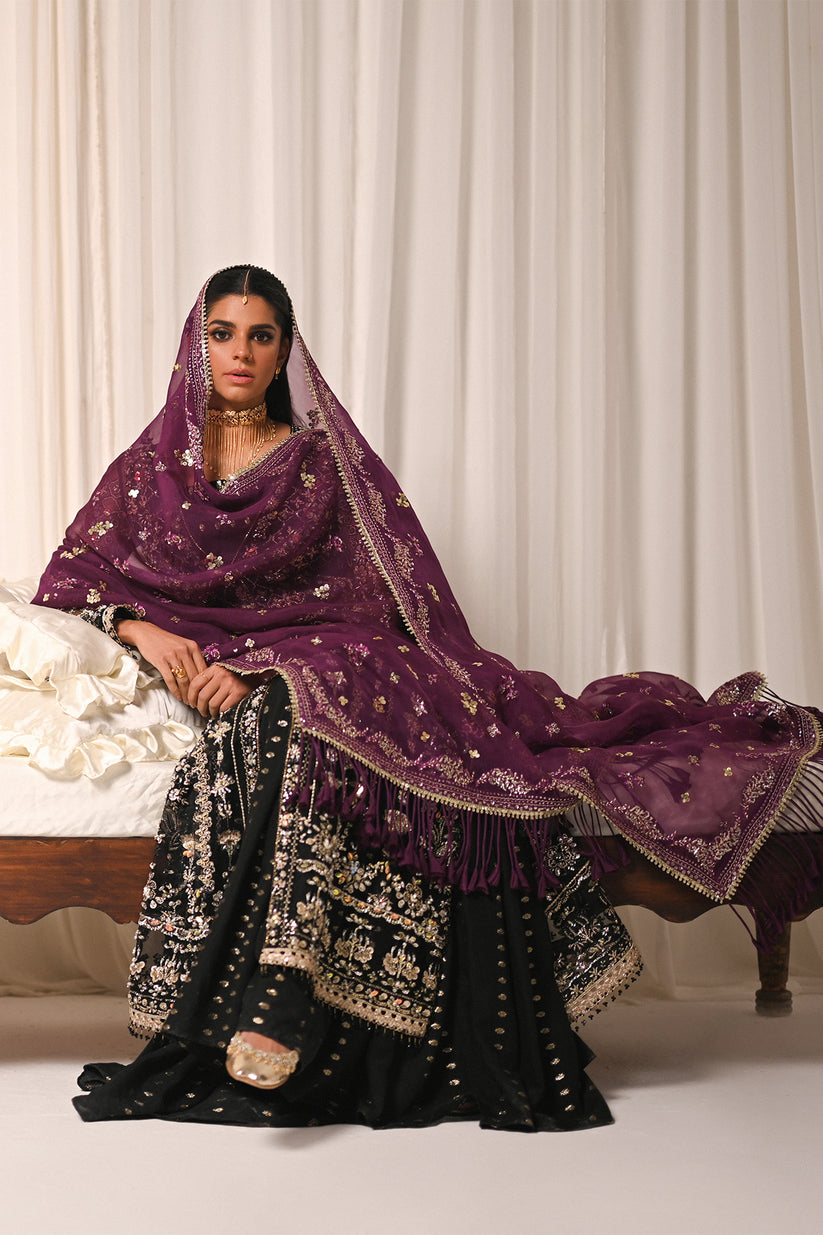 An elegant black ensemble adorned with intricate silver and gold embroidery, paired with a zari gharara for a touch of grandeur. The look is completed with a rich Vine colour dupatta featuring delicate floral work and sequins work exuding timeless sophistication.