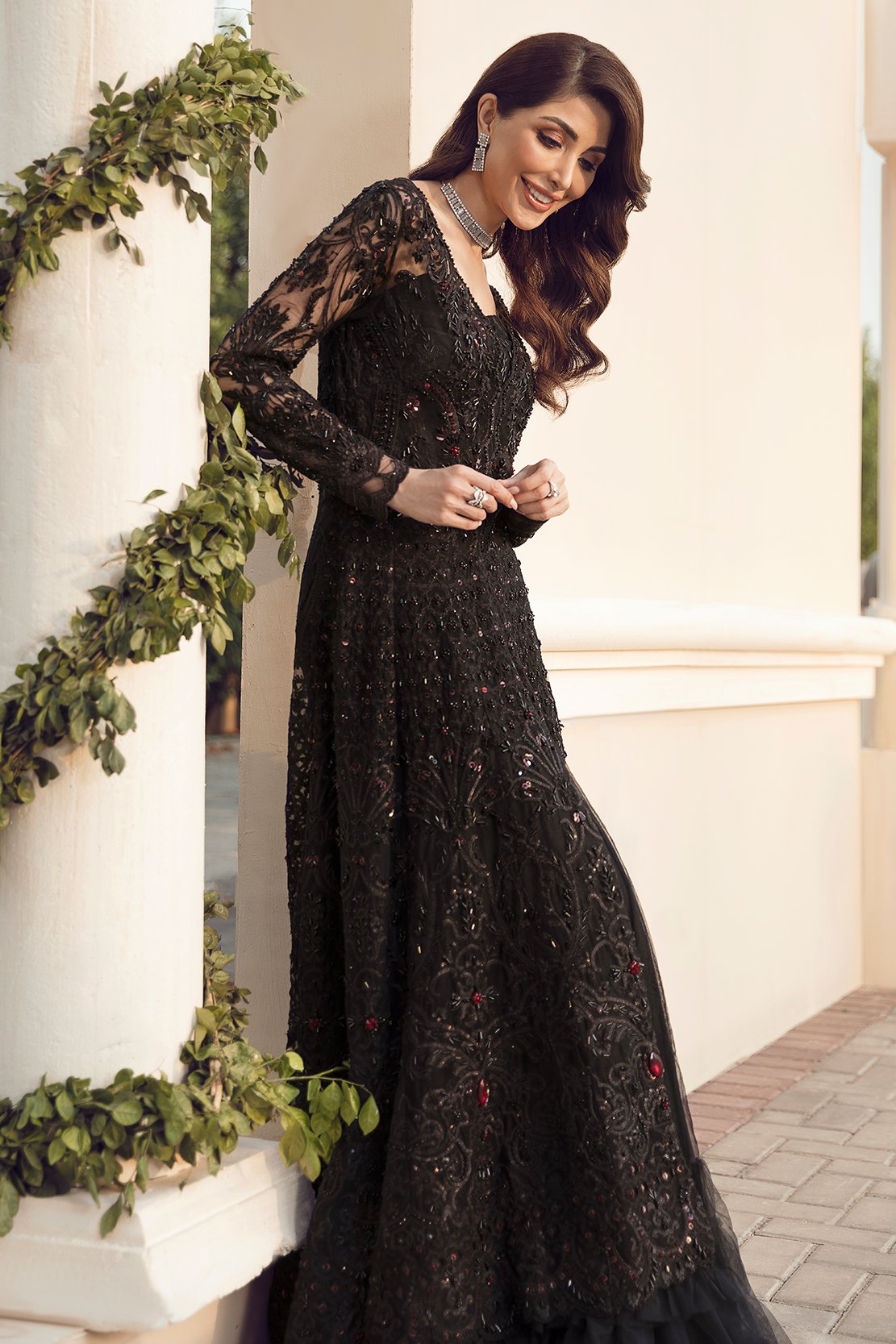 Dark black net gown paired with a matching net embroidered dupatta and a raw silk trouser. The ensemble features intricate embroidery, handcrafted with meticulous care, using various luxurious elements including pearls and Swarovski crystals.