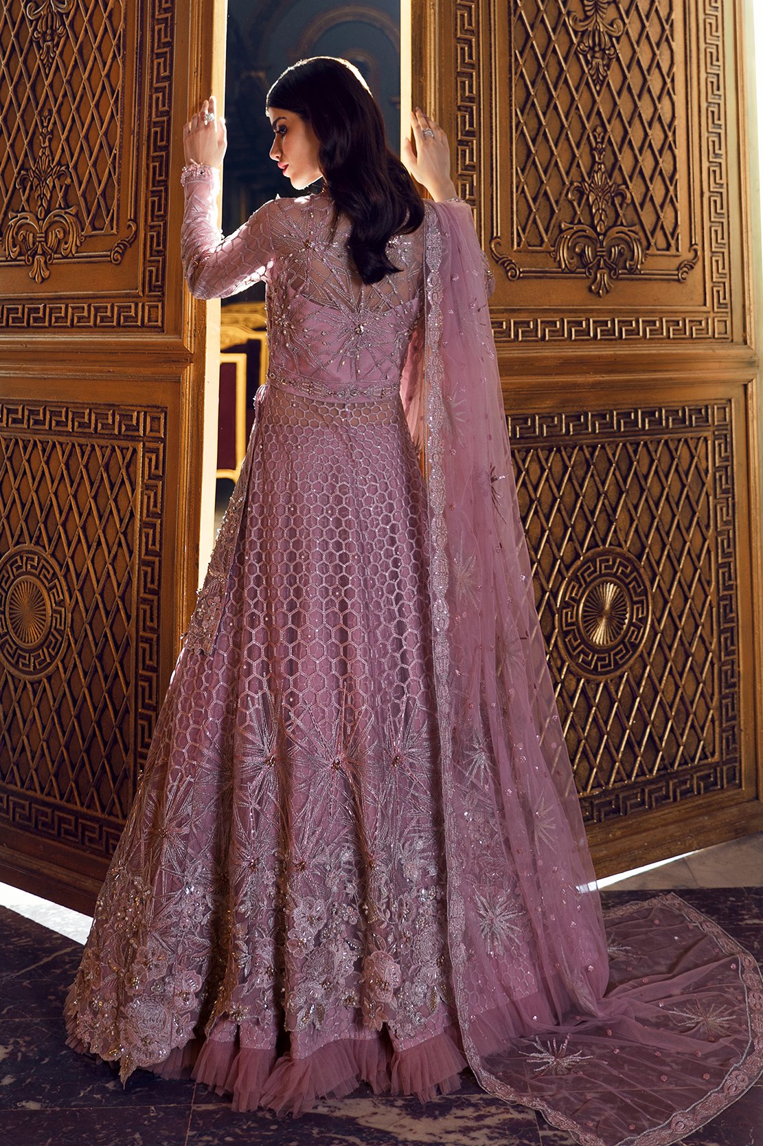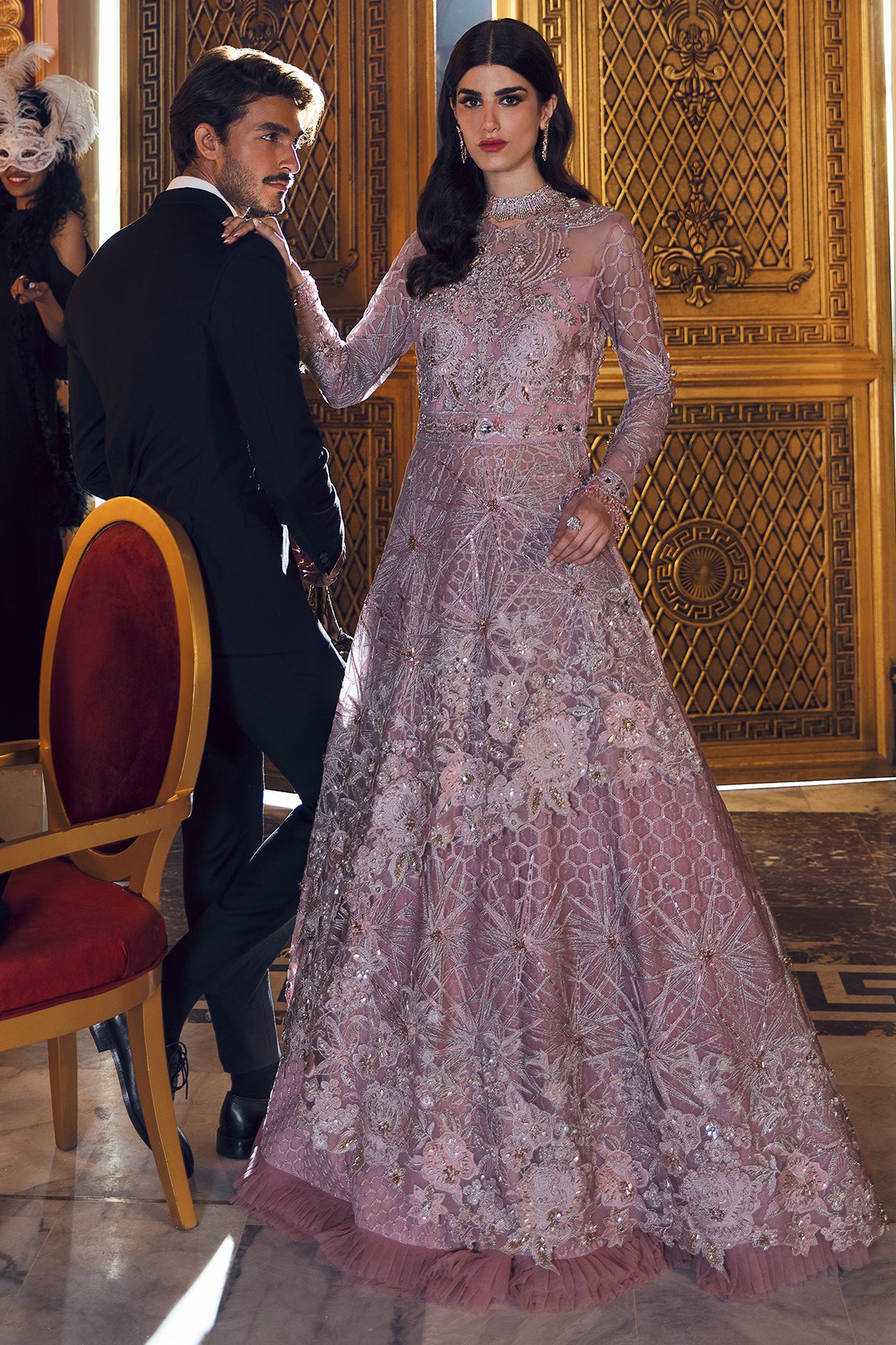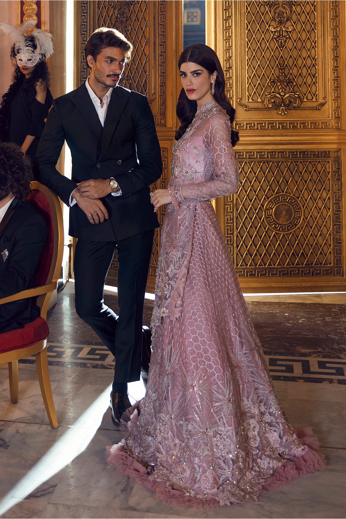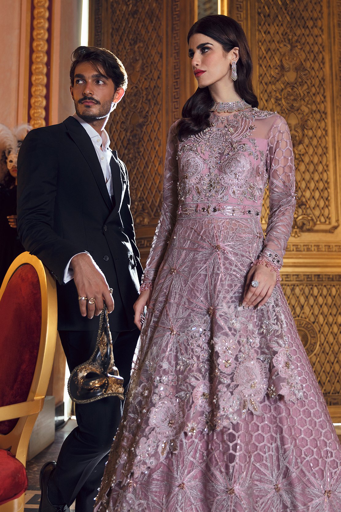 Pink net gown with detailed white embroidery done in various traditional inspired designs. Paired with a flowy net dupatta and a raw silk trouser. The intricate, hand-crafted embroidery uses crystals, pearls, diamondizes and Swarovski crystals.