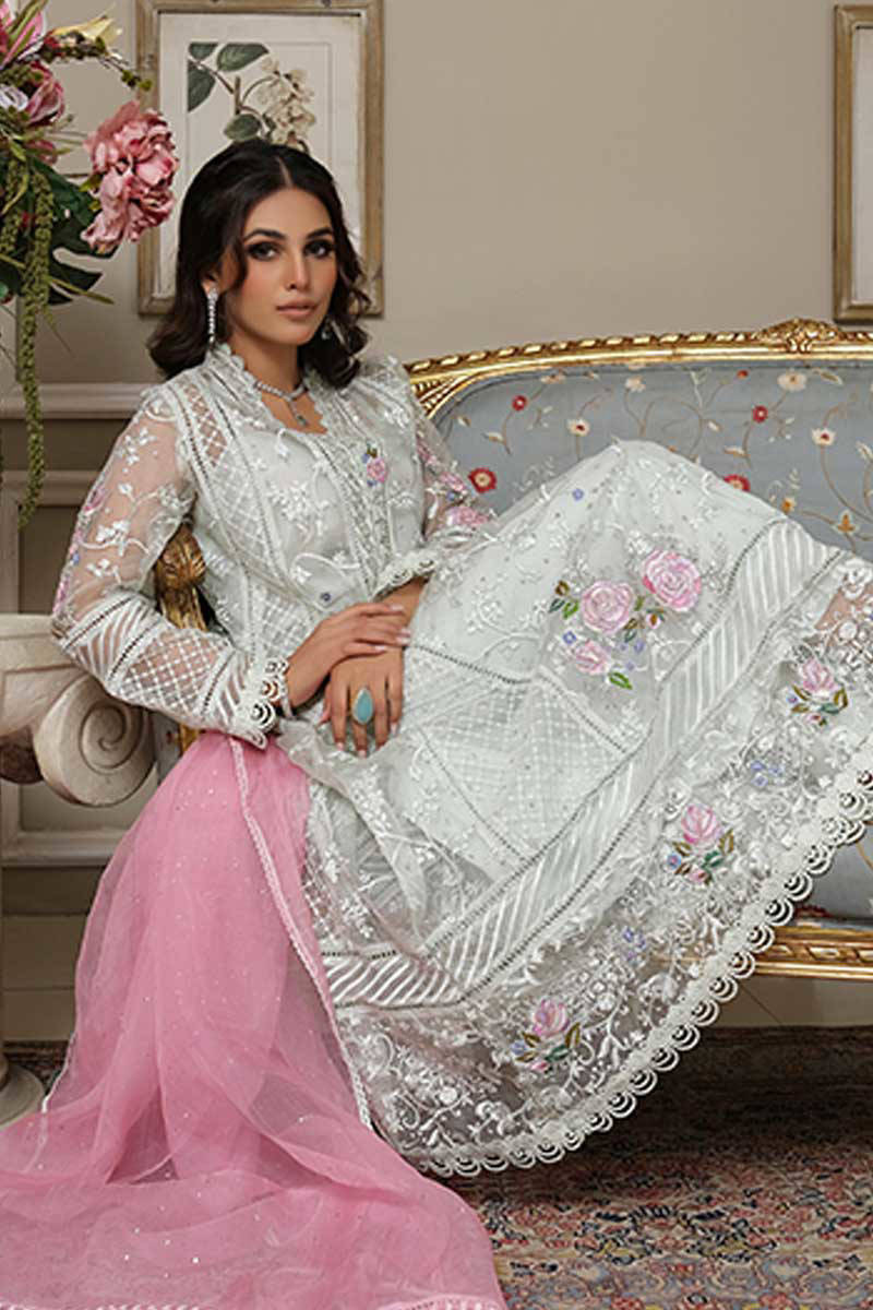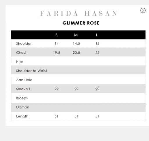 A timeless, uber flattering silhouette that will never go out of style, this hand embroidered organza outfit has beautiful quintessential Farida Hasan roses on the front and sleeves that sparkle ever so subtly. Dress it up with some dazzling diamond earrings for that elegant and sophisticated look. Comes with silk pants.
