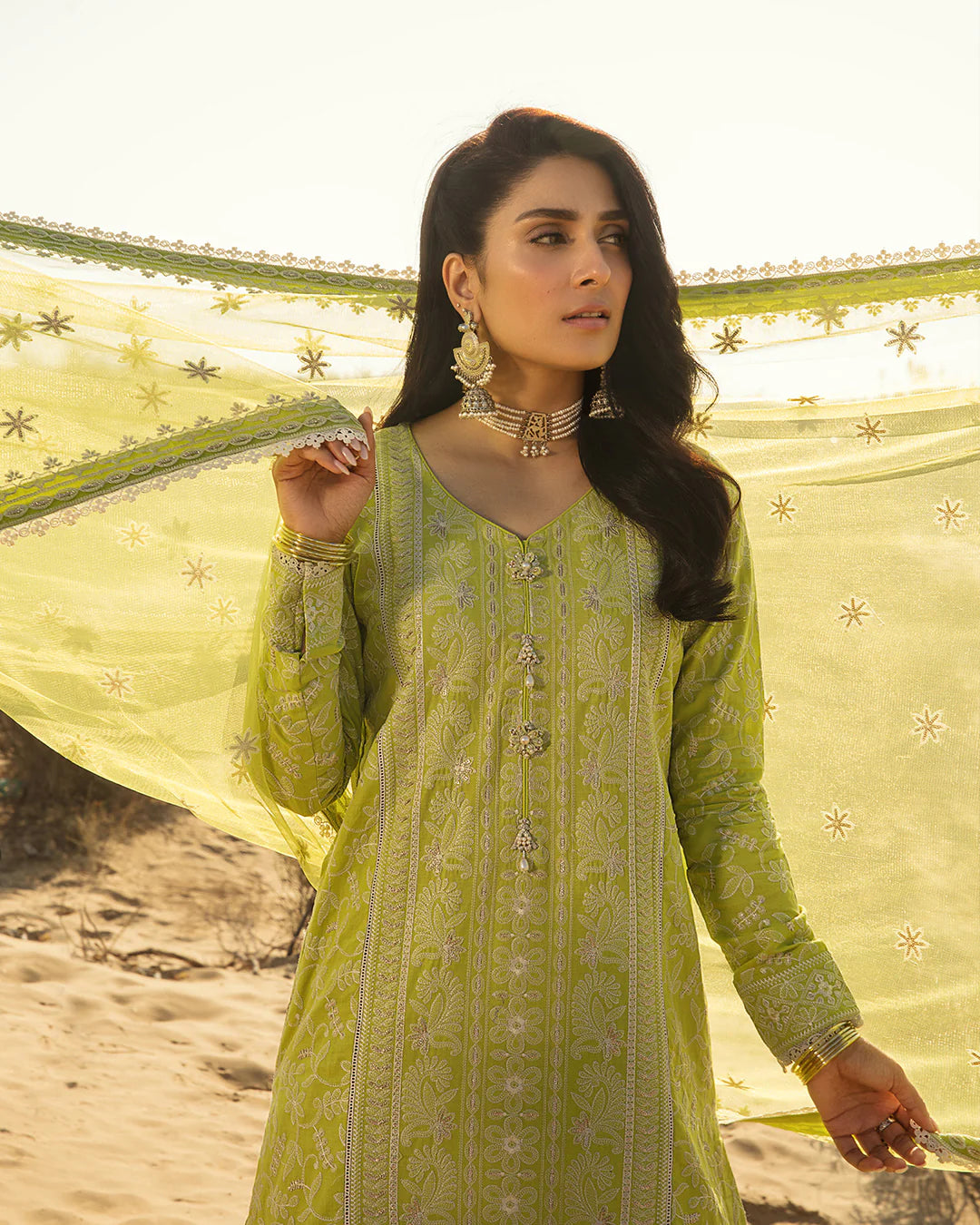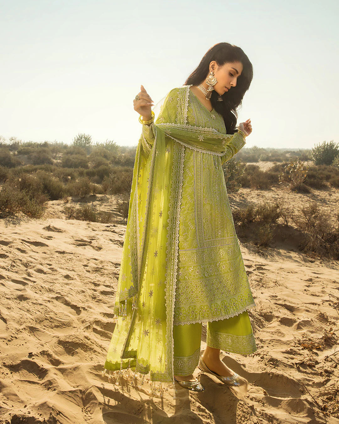 An exuberant lime green lawn is the canvas for Lara. Delicately embroidered into dainty florals with a dazzling creamy thread this number is a head turner. Elegant blooms are sewn on the net dupatta bordered with fine embroidery and lace embellishments.