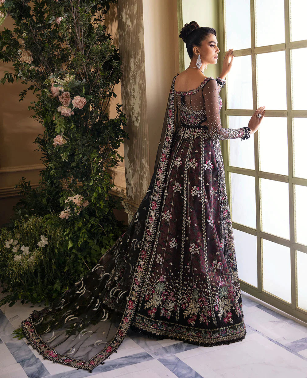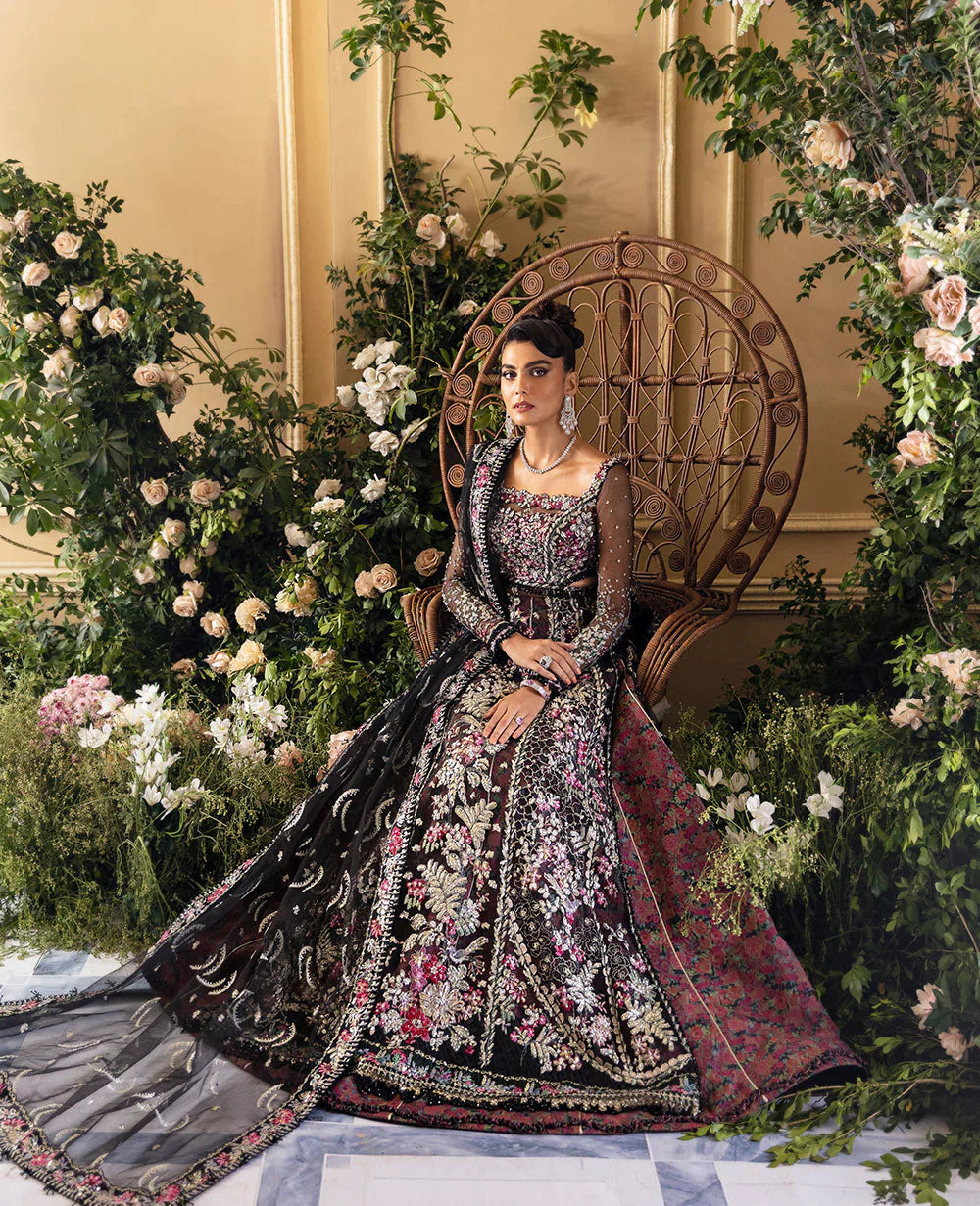 The enchantment of ‘Zamurd,’ a masterpiece where traditional craft meets contemporary grace. This A-line silhouette, with its five-panel organza front, exudes a regal air, making it a must-have for the fashion-forward wardrobe. The satin hem border adds a touch of sophistication, while the lehenga beneath blooms with a vibrant Shikargah print, inspired by the untamed beauty of nature. Subtle tones of red and pink mingle with greenery in a dance of color and life, creating a piece that’s both timeless and of the moment. Perfect for weddings or elegant soirées.