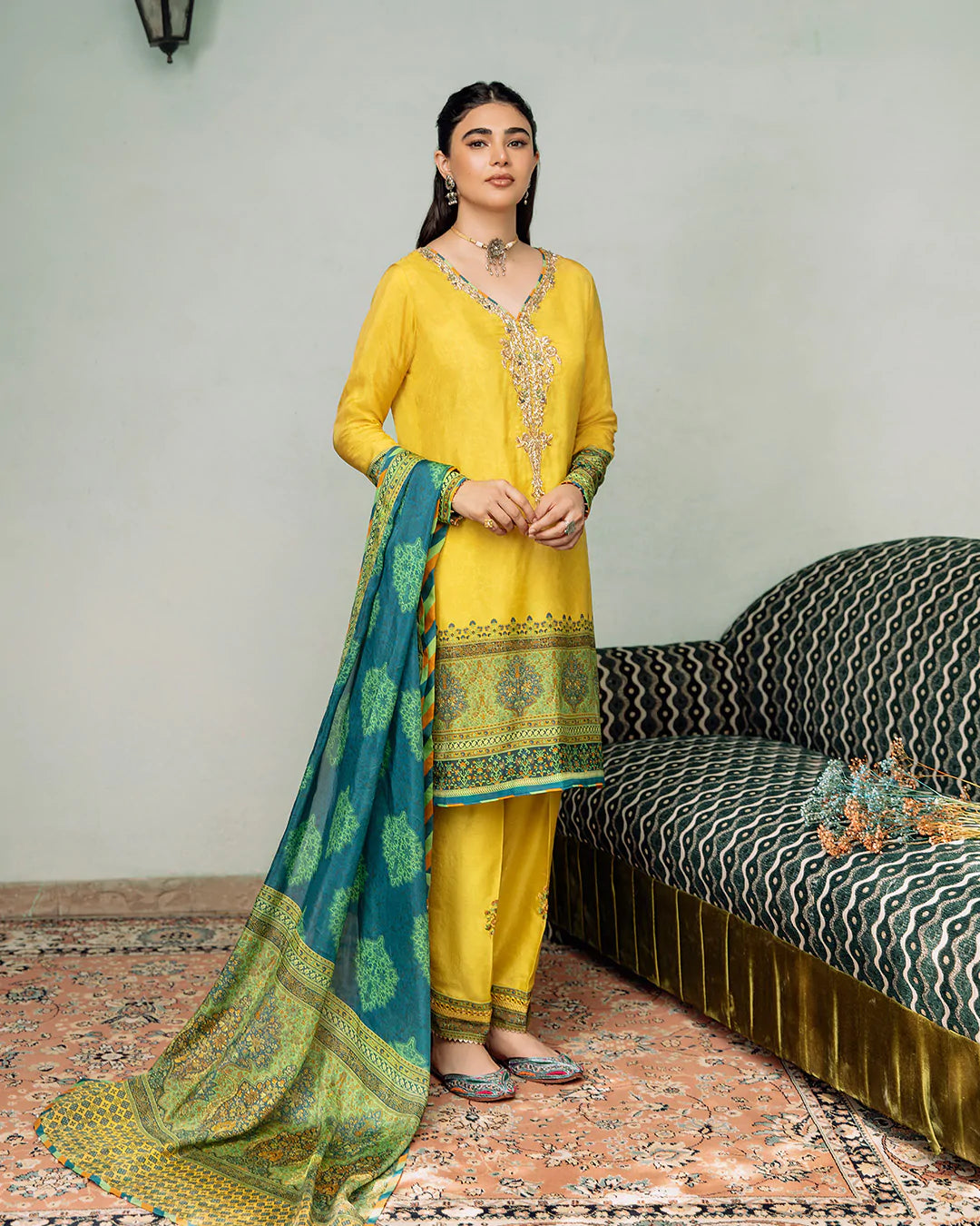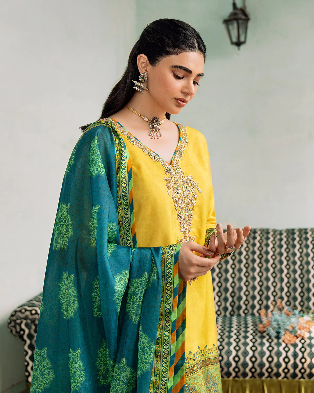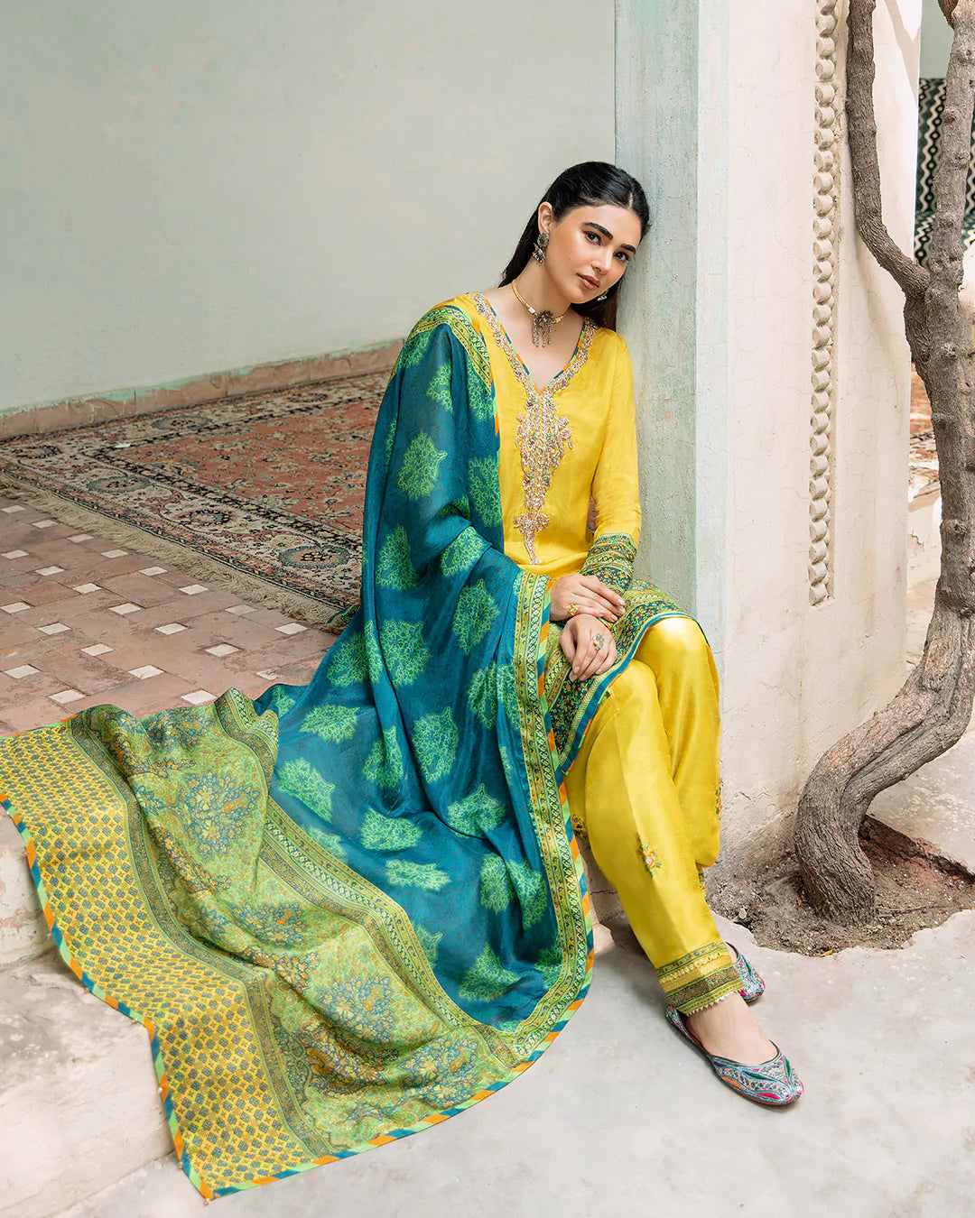 Cut from a bright yellow silk Mirha is digitally printed and boasts an embellished neck. The shirt is paired with a shalwar and a contrasting green dupatta that’s detailed with floral prints.