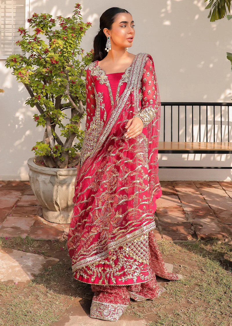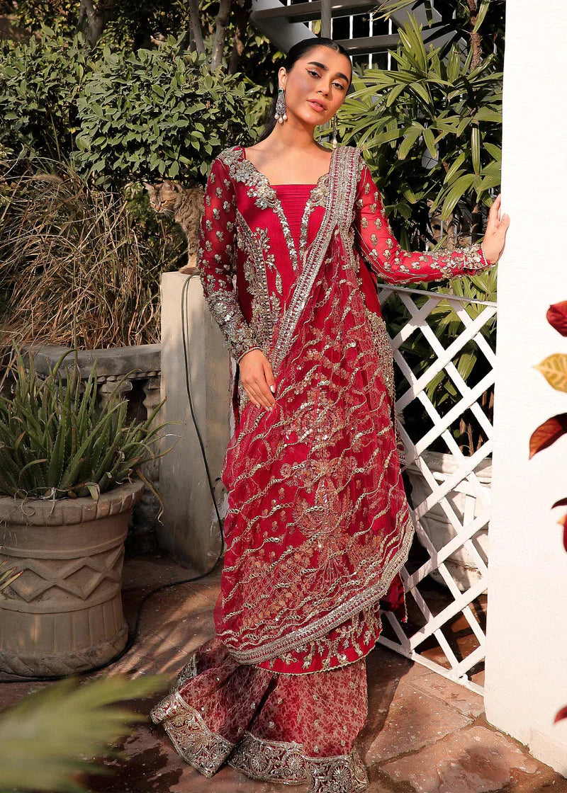 Additional Description: Presenting the ever so popular red! Meticulously embroidered tilla work to look like naqshi, the entire front is embellished in Gota patti, pearl and champagne crystals. The embroidery is a mix of beautiful floral borders and delicate jaalis. The dupp is adorned in Gota and pre stitched to be draped in any style. The Sharara is a beautiful vintage print with gold tilla booti scattered all over and finished with a tilla border. Make a show stopping entrance at any function! Slip- Cotton silk